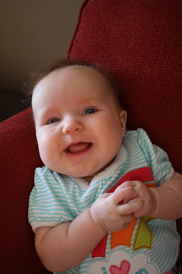 This little wiggle worm has scooted herself to the bottom and edge of the chair. YIKES! I may not be nominated for poor mommy of the year award for not putting sunscreen on my kids when we go to the park, but I might be a runner up if I allow my four month old to launch herself off the kitchen table. Needless to say, she is always buckled up now. This is new territory for me, Eli wasn't much of a wiggler. I would put him anywhere until he was about 9 months old and know he wasn't going to go anywhere. Not so with this little one; our little wiggle worm.